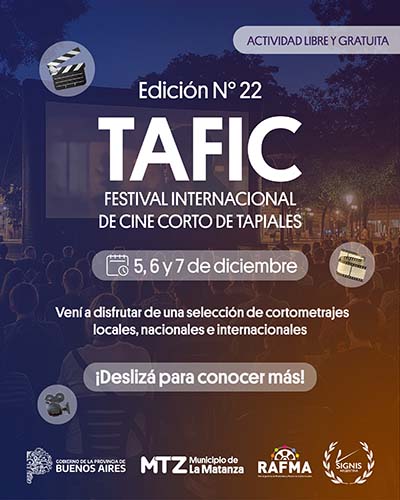 Del 5 al 7 de diciembre, las localidades de Ramos Mejía y Tapiales serán sede de la 22° edición del Festival Internacional de Cine Corto de Tapiales (TAFIC), organizado por el Municipio de La Matanza. Durante tres jornadas, vecinas y vecinos podrán disfrutar de manera libre y gratuita de una selección de producciones nacionales e internacionales.