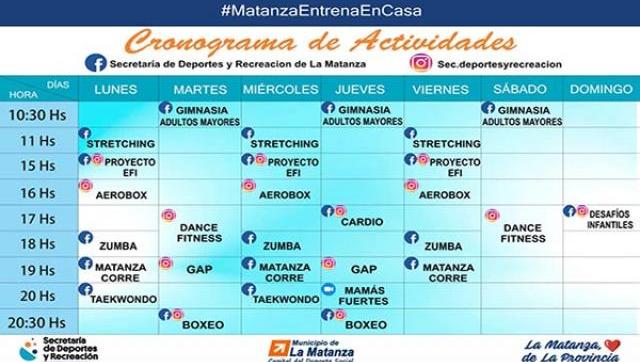 Las actividades que son en vivo se realizan siempre en los mismos días y horarios, para que cada persona pueda organizar su rutina deportiva. Por otro lado, en el caso de otras actividades como handball, básquet, taekwondo y propuesta lúdicas, no se realizan en vivo, sino que se suben videos directamente en las redes.