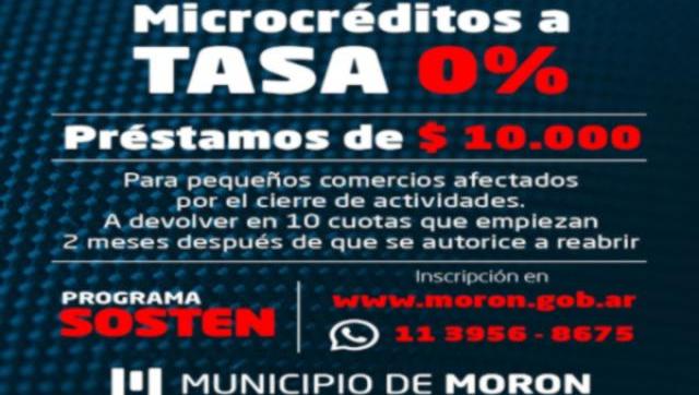El municipio de Morón convoca a comercios y sectores afectados por la pandemia a inscribirse en el Programa SOSTÉN, mediante el cual se otorgarán microcréditos a tasa cero destinados a reducir el impacto económico ocasionado por el cierre de actividades. Los préstamos serán de 10.000 pesos y deberán ser devueltos en 10 cuotas de 1.000 pesos cada una, que empezarán a imputarse dos meses después de la reapertura de la actividad. La inscripción se hará el sábado 25 y el domingo 26 de julio a través del portal www.moron.gob.ar.
