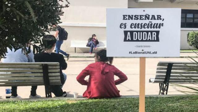 Una serie de carteles que fueron colocados en el predio de la Universidad Nacional de La Matanza (UNLaM) llaman la atención de los estudiantes. Contienen frases célebres sobre educación y cultura con motivo de la celebración de la Bienal de Arte Integral (BAI 2018) que tendrá lugar entre el 16 y el 27 de este mes.