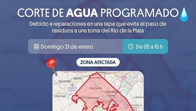 Este domingo 21 de enero se realizará un corte programado que afectará el suministro de agua. Será a partir de las 3 horas de la madrugada y la presión se verá afectada desde las 5 horas de la mañana hasta aproximadamente las 15 horas.