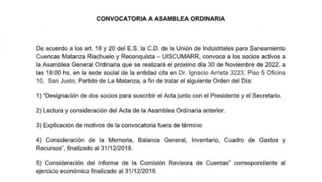 De acuerdo a los art. 18 y 20 del E.S. la C.D. de la Unión de Industriales para Saneamiento Cuencas Matanza Riachuelo y Reconquista – UISCUMARR, convoca a los socios activos a la Asamblea General Ordinaria que se realizará el próximo día 30 de Noviembre de 2022, a las 18:00 hs. en la sede social de la entidad cita en Dr. Ignacio Arrieta 3223, Piso 5 Oficina 10, San Justo, Partido de La Matanza, a fin de tratar el siguiente Orden del Día: