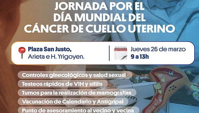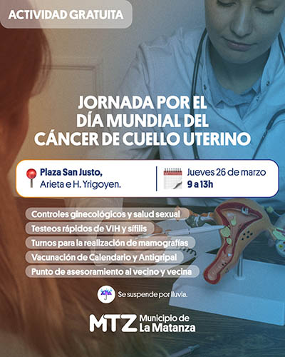En el marco del Día Mundial de la Prevención del Cáncer de Cuello Uterino, el Municipio de La Matanza llevará adelante una jornada de salud integral este jueves 26 de marzo, de 9 a 13, en la Plaza San Martín de San Justo.