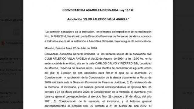 Convocase Asamblea General Ordinaria a los señores socios de la asociación civil CLUB ATLETICO VILLA ANGELA el día 22 de Agosto de 2024 a las 19:00 hs, en la sede social de la entidad, sita en la calle CARLOS CALVO Y PIZARRO S/N, Localidad de Moreno, Provincia de Buenos Aires , a los efectos de considerar el siguiente orden del día: