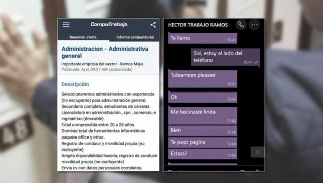 En ese marco de feminización de la pobreza, en las últimas semanas en Facebook y Twitter distintas mujeres compartieron historias de acoso ante un mismo aviso laboral publicado en Computrabajo y otros sitios de búsquedas virtuales. Detrás de la oferta estaba Héctor, el supuesto dueño de una constructora ubicada en Ramos Mejía llamada Omega Asociados. Los relatos de las chicas son calcados. A pesar de que se trataba de un puesto de secretaria/administrativa, el hombre las contactaba por WhatsApp y les hacía comentarios que evidenciaban que el trabajo no era lo que decía el perfil del anuncio. Se trata de las denominadas ofertas laborales engañosas que, en algunos casos, pueden ser el primer eslabón de un caso de trata de personas con fines de explotación laboral y/o sexual.