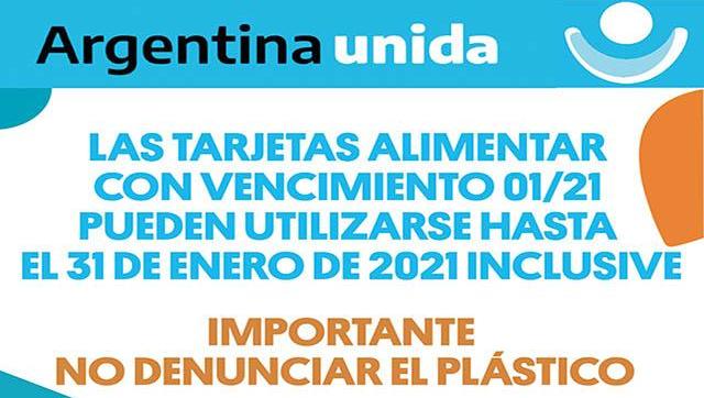 La Secretaría de Desarrollo Social del Municipio de La Matanza dio a conocer a los titulares de las Tarjetas Alimentar cuyo vencimiento tienen fecha 01/21, que podrán seguir utilizándolas hasta el 31 de enero del 2021 inclusive.