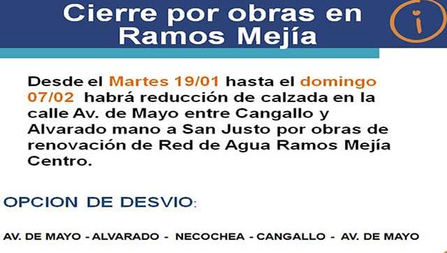 La Secretaría de Tránsito y Transporte del Municipio de La Matanza dio a conocer que a partir del día martes 19 de enero hasta el domingo 7 de febrero se reducirá la calzada en Avenida de Mayo entre Alvarado y Cangallo, mano a San Justo, por obras de renovación en la red de agua potable de Ramos Mejía centro.