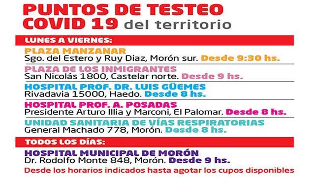 A partir de este lunes 10 de enero el municipio de Morón dispuso más centros de testeos los cuales son:
