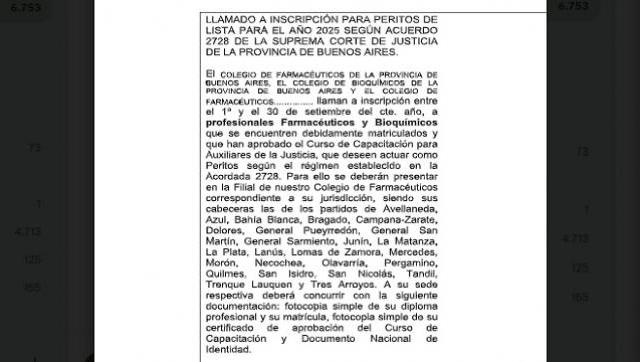 Colegio de Farmacéuticos de la Provincia de Buenos Aires, el Colegio DE BIOQUÍMICOS de la Provincia de Buenos Aires y el Colegio de FARMACÉUTICOS llaman a inscripción entre el 1º y el 30 de setiembre del corriente año, a profesionales Farmacéuticos y Bioquímicos que se encuentren debidamente matriculados y que han aprobado el Curso de Capacitación para Auxiliares de la Justicia, que deseen actuar como Peritos según el régimen establecido en la Acordada 2728.